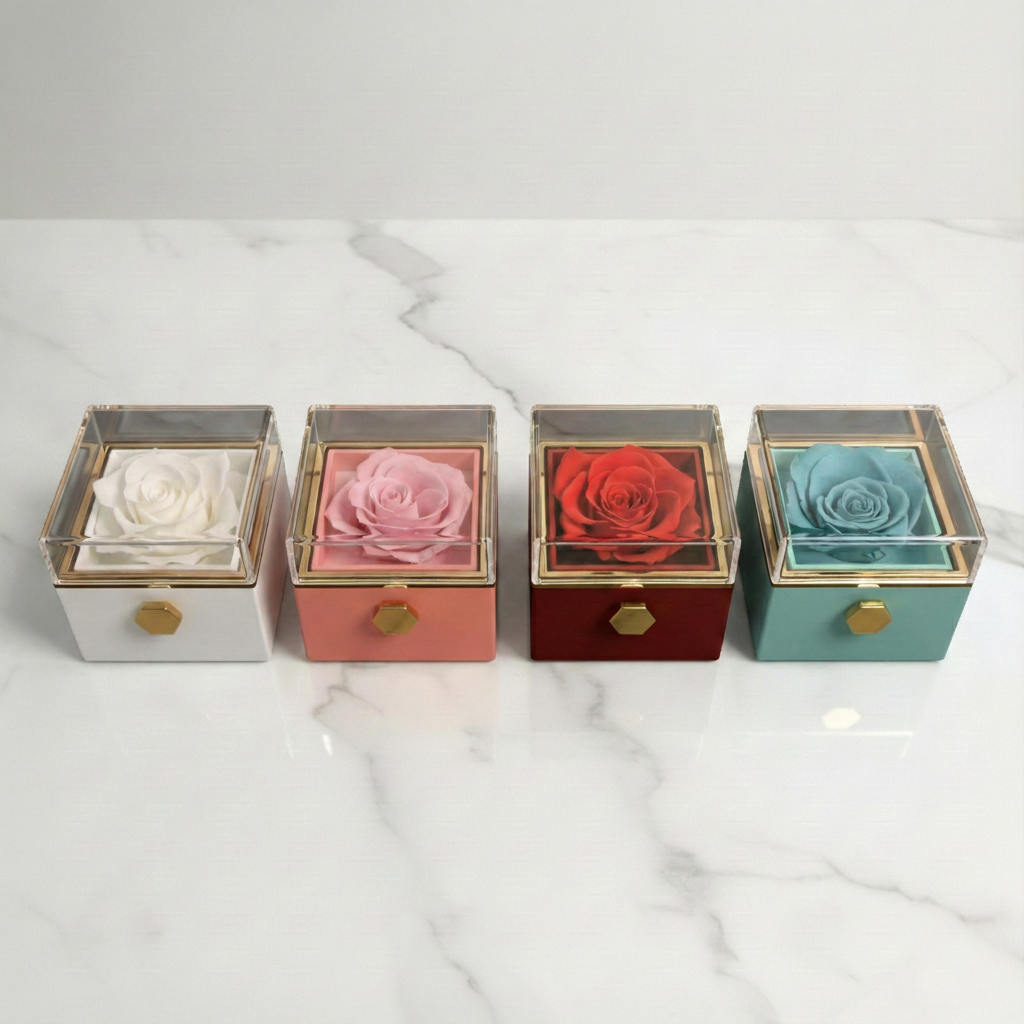 Magická růže s ukrytým šperkem - Kombinace elegance a originálního překvapení. Tento dárkový box obsahuje nádhernou stabilizovanou růži, která si zachová svůj vzhled po dlouhou dobu. Unikátní otočný mechanismus uvnitř krabičky navíc ukrývá stylový řetízek z nerezové oceli s motivem dvou srdcí, na který si můžete nechat vygravírovat vlastní jména. Ideální dárek k výročí, narozeninám nebo Valentýnu – připravený rovnou k předání.